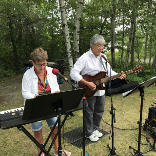 Deacon Lee Grim visits with Bishop Jelinek on Red Pine Island after a visit to Rainy Lake and HTEC.